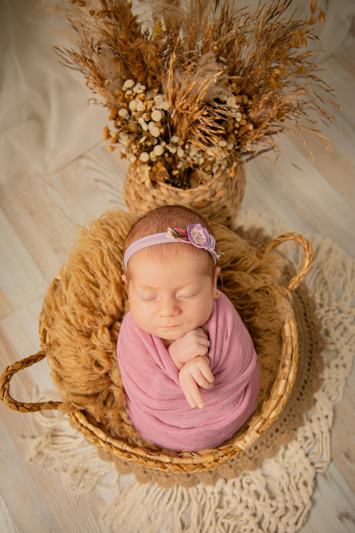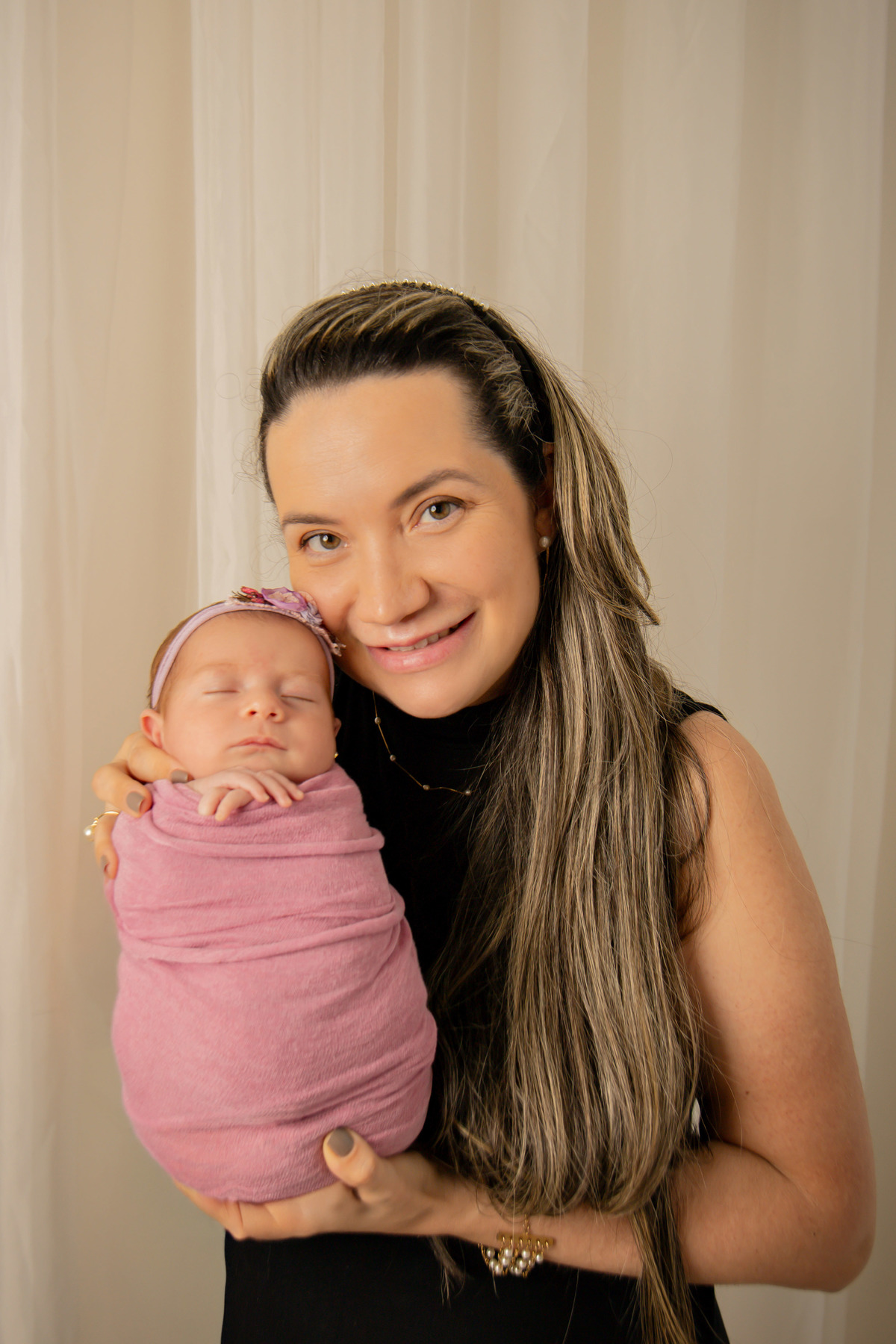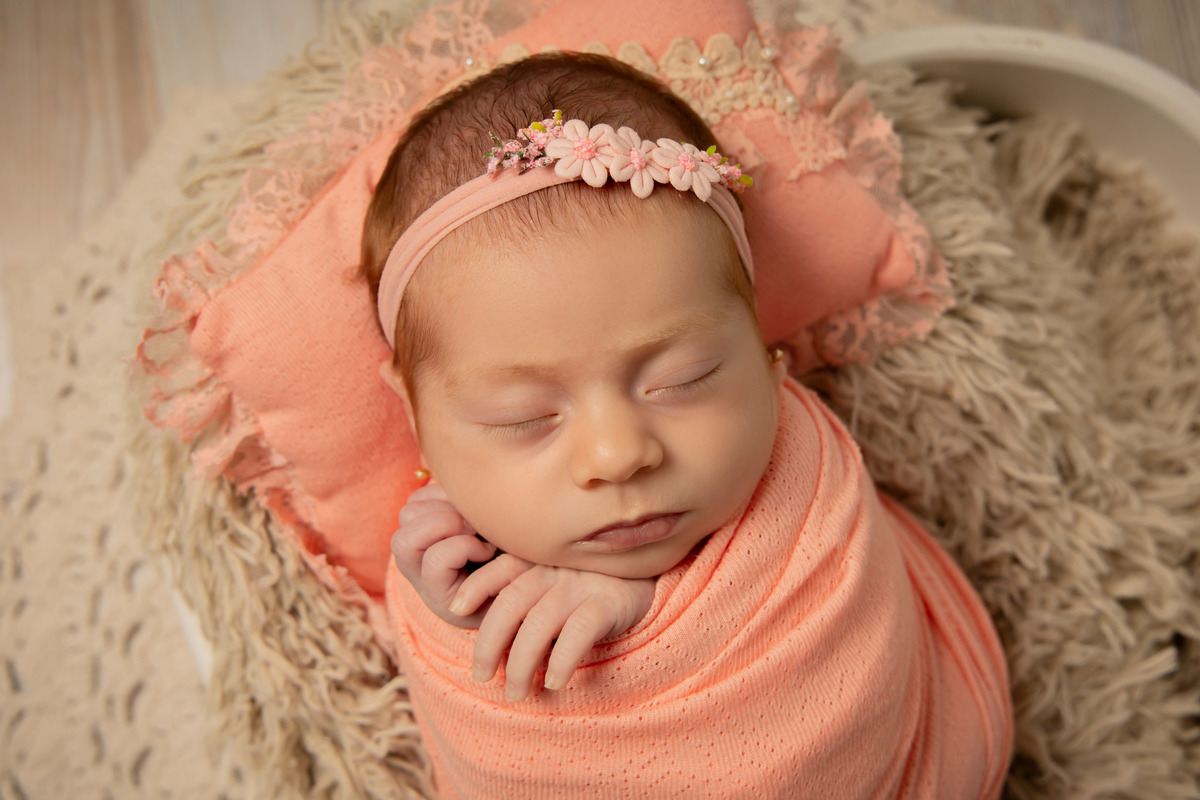 A sessão da Clara foi especial e um pouco diferente. Fizemos as fotos dela com 29 dias de vida, já fora do período ideal para sessões newborn, que é entre 8 e 15 dias. Antes de iniciarmos, fui bem transparente com a mãe, explicando que havia a possibilidade de a sessão não correr como esperado devido à idade da Clara. Mesmo assim, decidimos tentar, e, felizmente, tudo deu certo! A Clara demorou um pouco mais para pegar no sono, então, para garantir o conforto e a segurança dela, fiz as fotos apenas no wrap, mantendo-a apertadinha e tranquila. Esse cuidado foi essencial para que a sessão fosse um sucesso e resultasse nas imagens lindas que esperávamos.